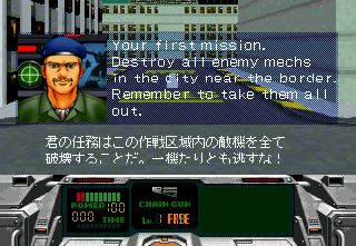 ロボの操縦を覚えながら街をうろついて、ついでに敵を全部破壊すれば、1面クリアよ!! |